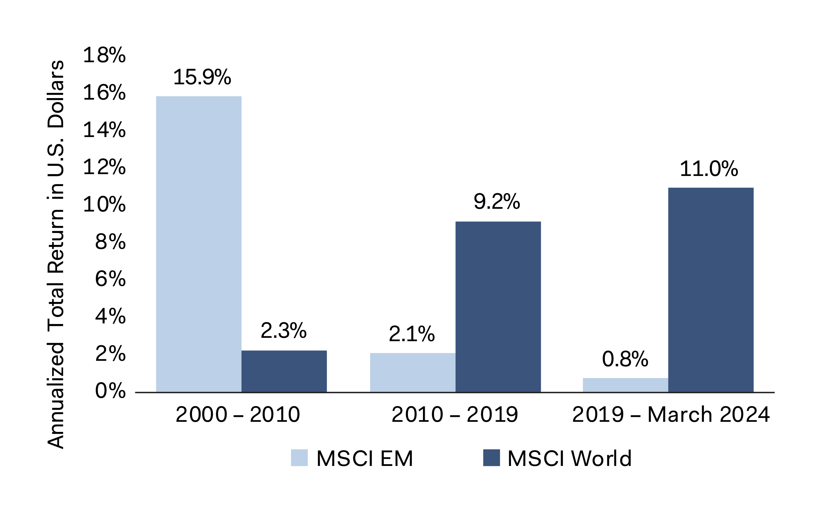 • December 2019 to March 2024: The COVID-19 pandemic disproportionately harmed EM, resulting in their significant underperformance during and after the pandemic. Increasing global geopolitical tensions, China's struggling economy, the dominance of a few U.S. technology giants (known as the Magnificent Seven),6 and less direct exposure to transformative technologies (e.g., artificial intelligence) further widened the performance gap.