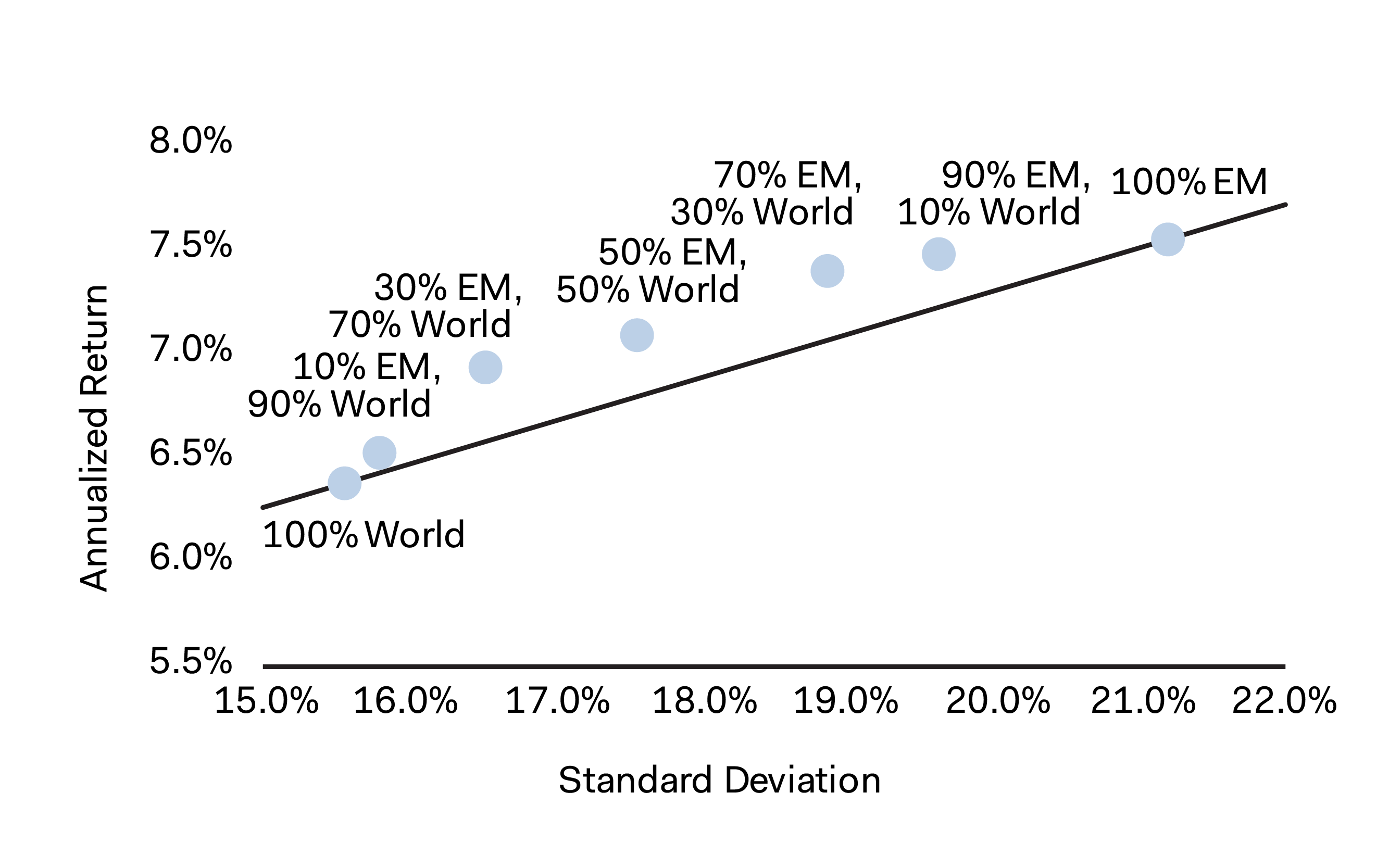 Figure 3. Average Annual Total Return of Portfolios of MSCI EM and MSCI World Rebalanced Monthly (1999 through March 31, 2024)10