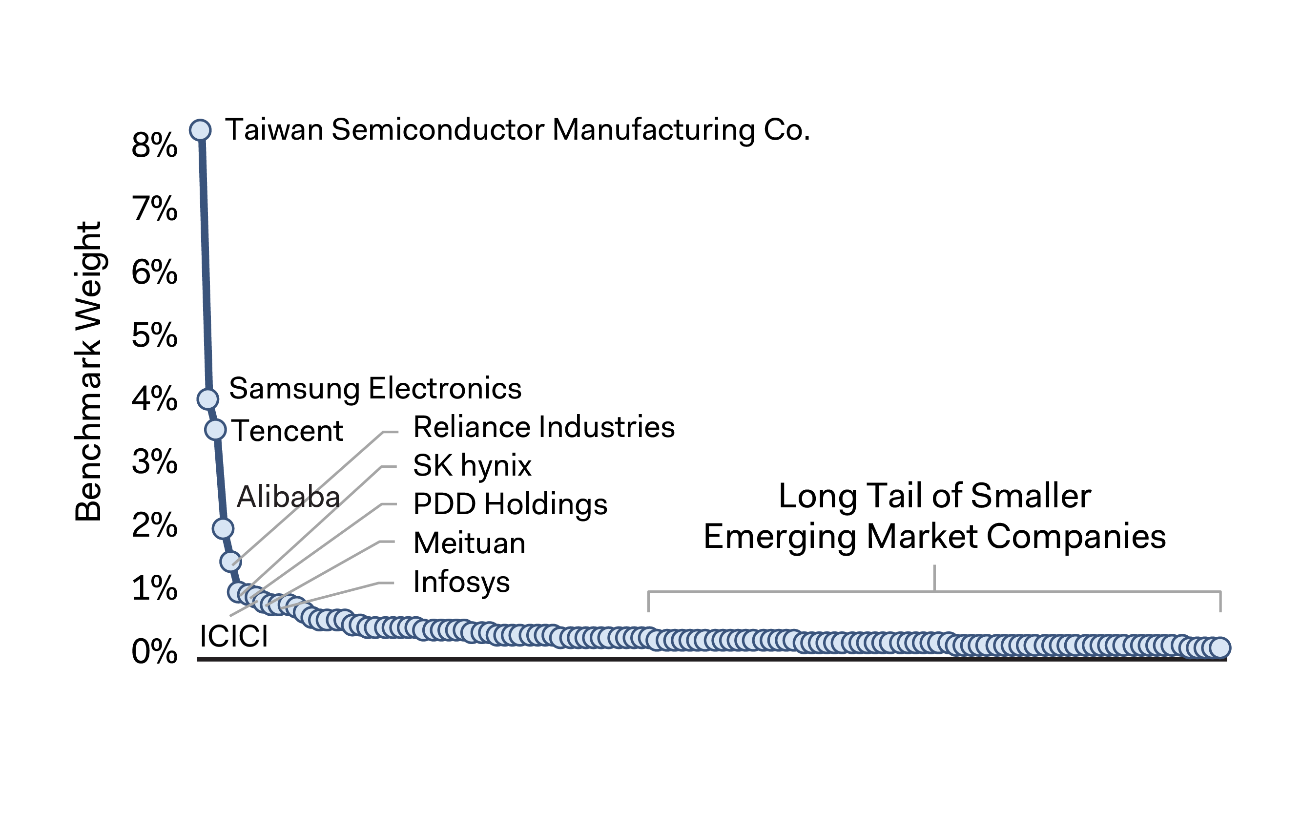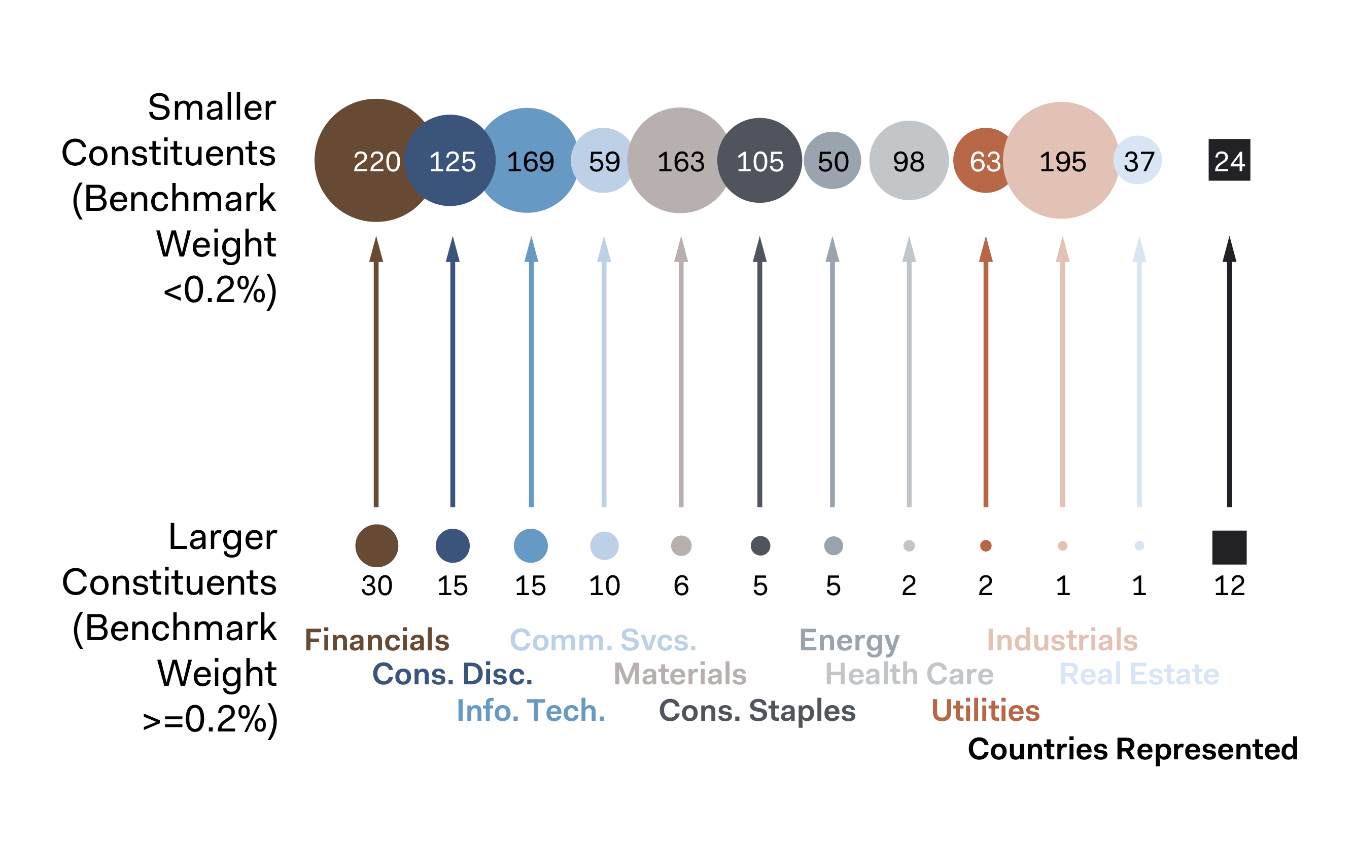 Smaller companies often operate in niche markets or serve local needs, providing a different risk-return profile from larger, more globally oriented firms. As shown in Figure 4, 69% of the MSCI EM’s constituents are less than 0.05% positions (versus 34% of the S&P 500 and 45% of the MSCI EAFE). Investing in this long tail of smaller EM companies can help spread risk across a broader spectrum of industries and regions. For example, in the Industrials sector, there is only one larger company that has a weight greater than 0.20% in the MSCI EM, but there are 195 smaller companies with weights less than 0.20% (see Figure 5).