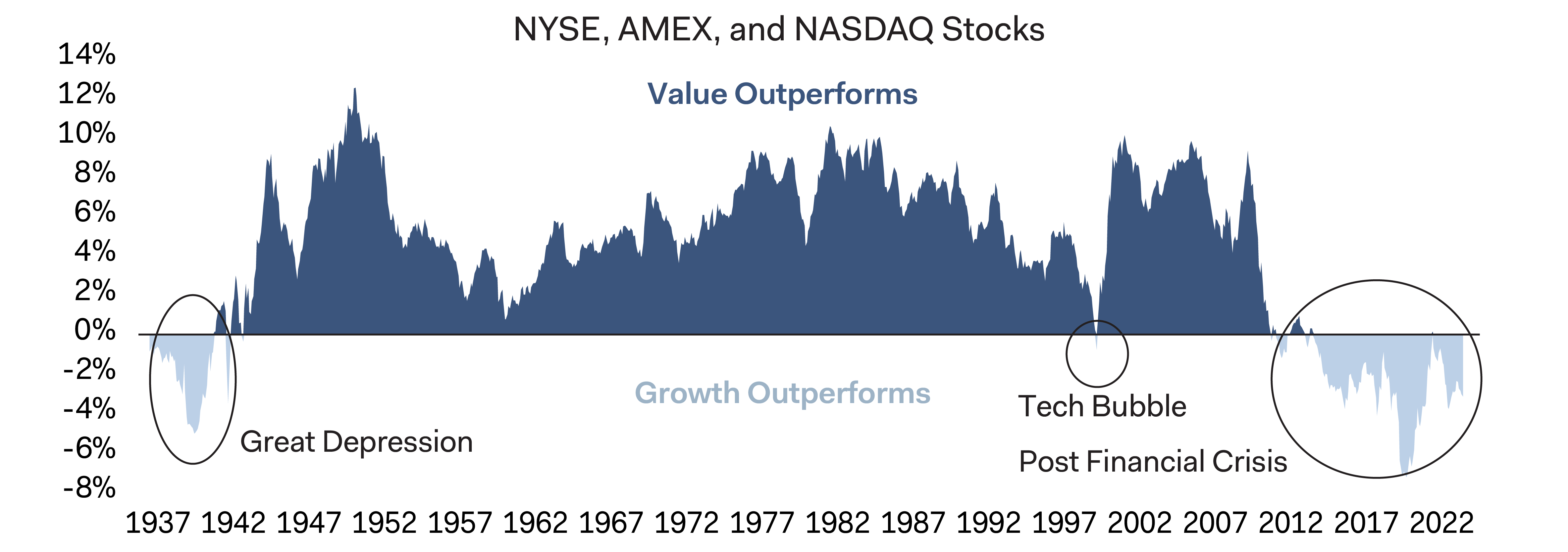 Value investing has stood the test of time despite periodic challenges and shifting market dynamics. Over shorter periods, the relative performance of growth and value stocks1 has seesawed, but value strategies have nearly always outperformed over horizons of a decade or more (see Figure 1). In fact, there have been only three periods over the past 90+ years when value stocks have underperformed on a rolling ten-year basis in the United States: the Great Depression, the Technology Stock Bubble, and after the Global Financial Crisis.