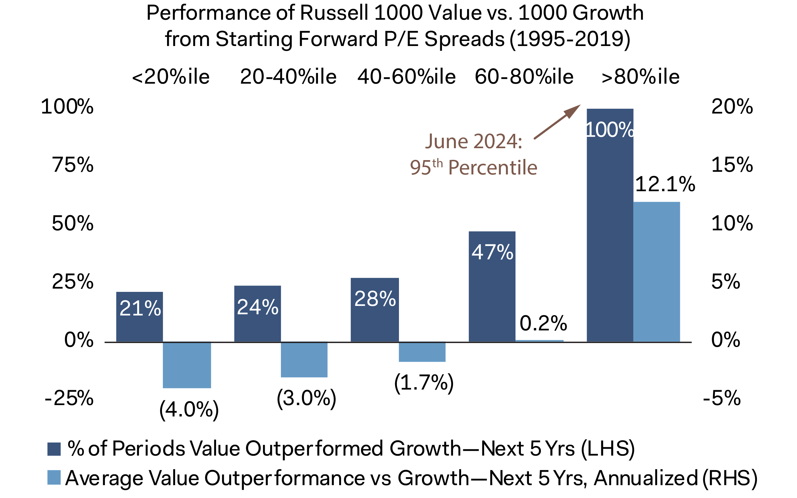 Historically, the Russell 1000 Value has outperformed the Russell 1000 Growth for every 5-year period when the valuation spread has been wider than the 80th percentile (see Figure 3). On June 30, 2024, this spread was in the 95th percentile.