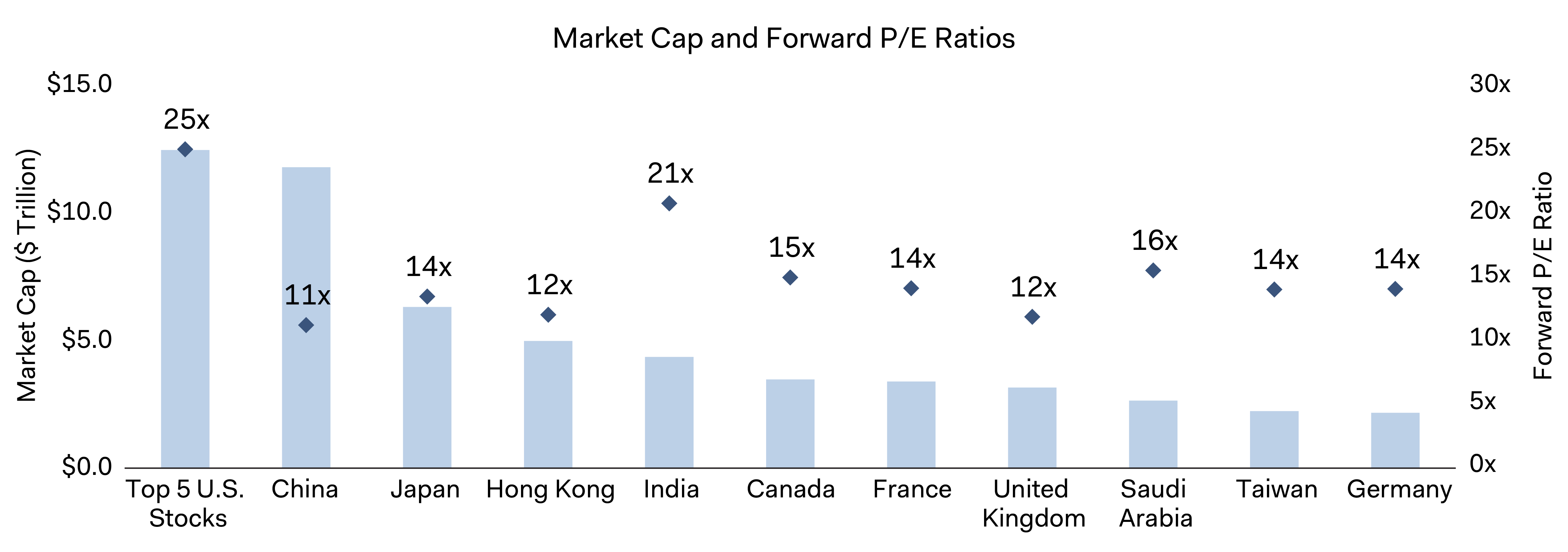 6. “Top 5 U.S. Stocks” includes the top 5 companies with the largest weight in the S&P 500 as of the most recent quarter end period and represents a summation of their individual market caps. Forward price-to-earnings ratio value for the “Top 5 U.S. Stocks” is a market capitalization weighted average of the individual companies and is sourced from FactSet. Market capitalization values for the subsequently listed countries are sourced from the latest available market cap data on CEIC. Forward P/E values for the countries listed are sourced from FactSet.
