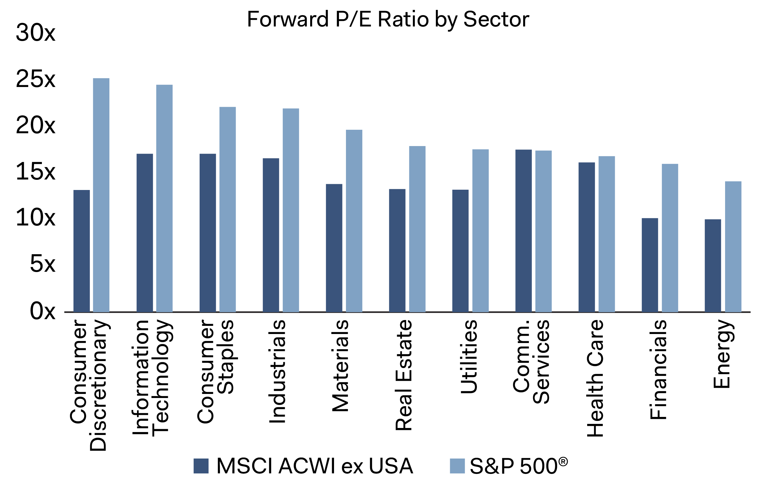 This valuation discount is broad-based at the sector level; most international sectors are meaningfully cheaper than their U.S. counterparts (see Figure 2). In addition, over half of international sectors trade at or below their 20-year median forward price-to-earnings ratio, whereas all U.S. sectors trade at or above this metric.