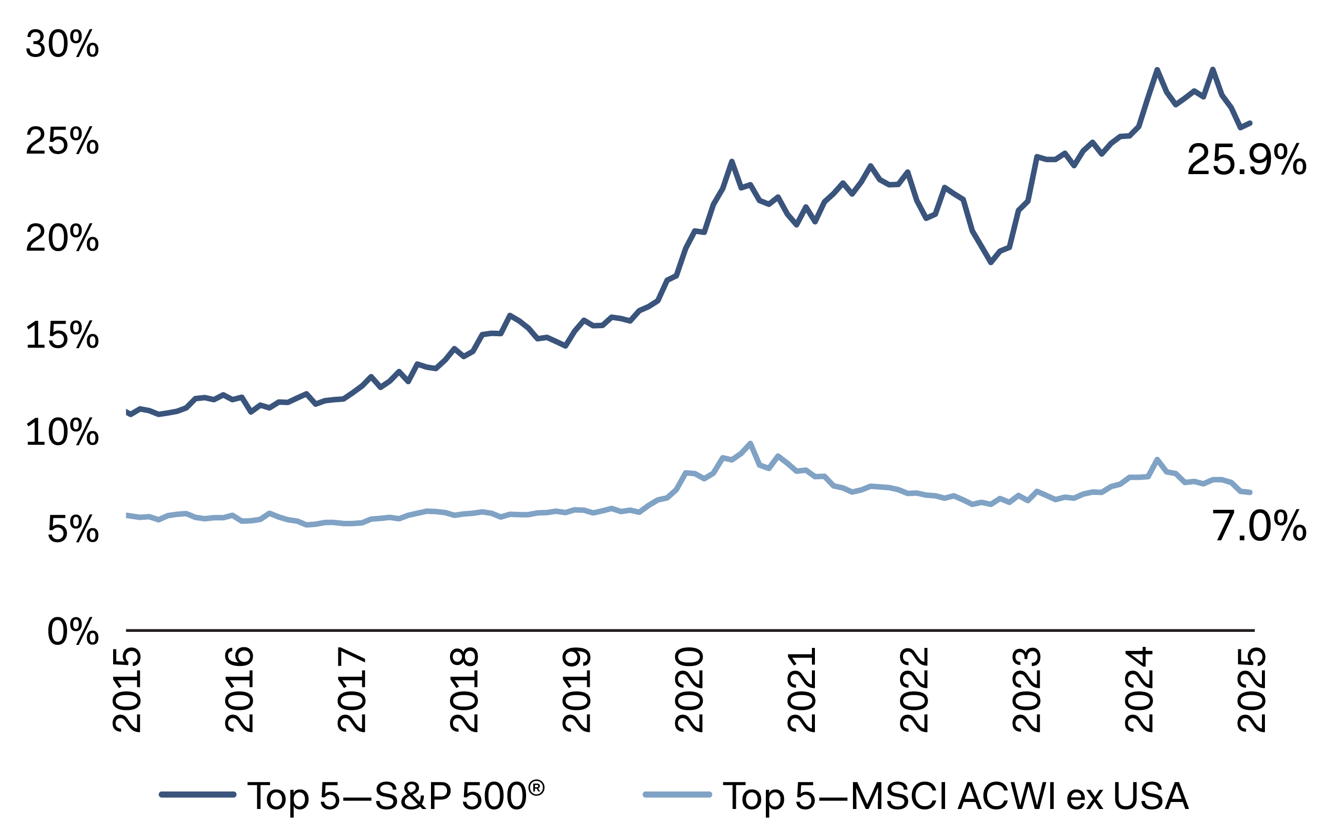 The U.S. equity market is much more concentrated than the international equity market (see Figure 3). A handful of large technology and consumer-related companies dominate a sizable portion of the U.S. market. The combined size of the top five largest holdings in the S&P 500—Apple, Microsoft, NVIDIA, Amazon, and Alphabet—is greater than the market capitalization of any economy outside of the United States (see Figure 4). As of April 30, these five holdings accounted for 25.7% of the S&P 500’s total market capitalization.5 In contrast, the top five stocks in the MSCI ACWI ex USA comprised only 7.0% of that Index’s total market capitalization. International markets are typically more diversified with less dominance from any single sector or individual security.