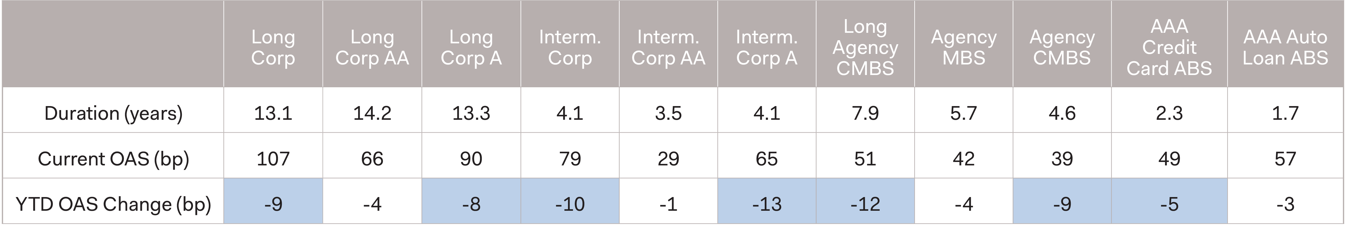 4. Indices used in the analysis: AAA Auto Loan ABS: Bloomberg ABS Auto AAA Index; AAA Credit Card ABS: Bloomberg ABS Credit Card AAA Index; Agency CMBS: Bloomberg U.S. Agency CMBS Agg Index; Agency MBS: Bloomberg U.S. MBS Agency Fixed Rate MBS Index; Long Agency CMBS: Bloomberg U.S. Agency CMBS 8.5+ Year Index; Intermediate Corp: Bloomberg U.S. Intermediate Corporate Bond Index; Intermediate Corp A: Bloomberg U.S. Intermediate Corporate A Index; Intermediate Corp AA: Bloomberg U.S. Intermediate Corporate AA Index; Long Corp: Bloomberg U.S. Long Corporate Bond Index; Long Corp A: Bloomberg U.S. Long Corporate A Index; Long Corp AA: Bloomberg U.S. Long Corporate AA Index.