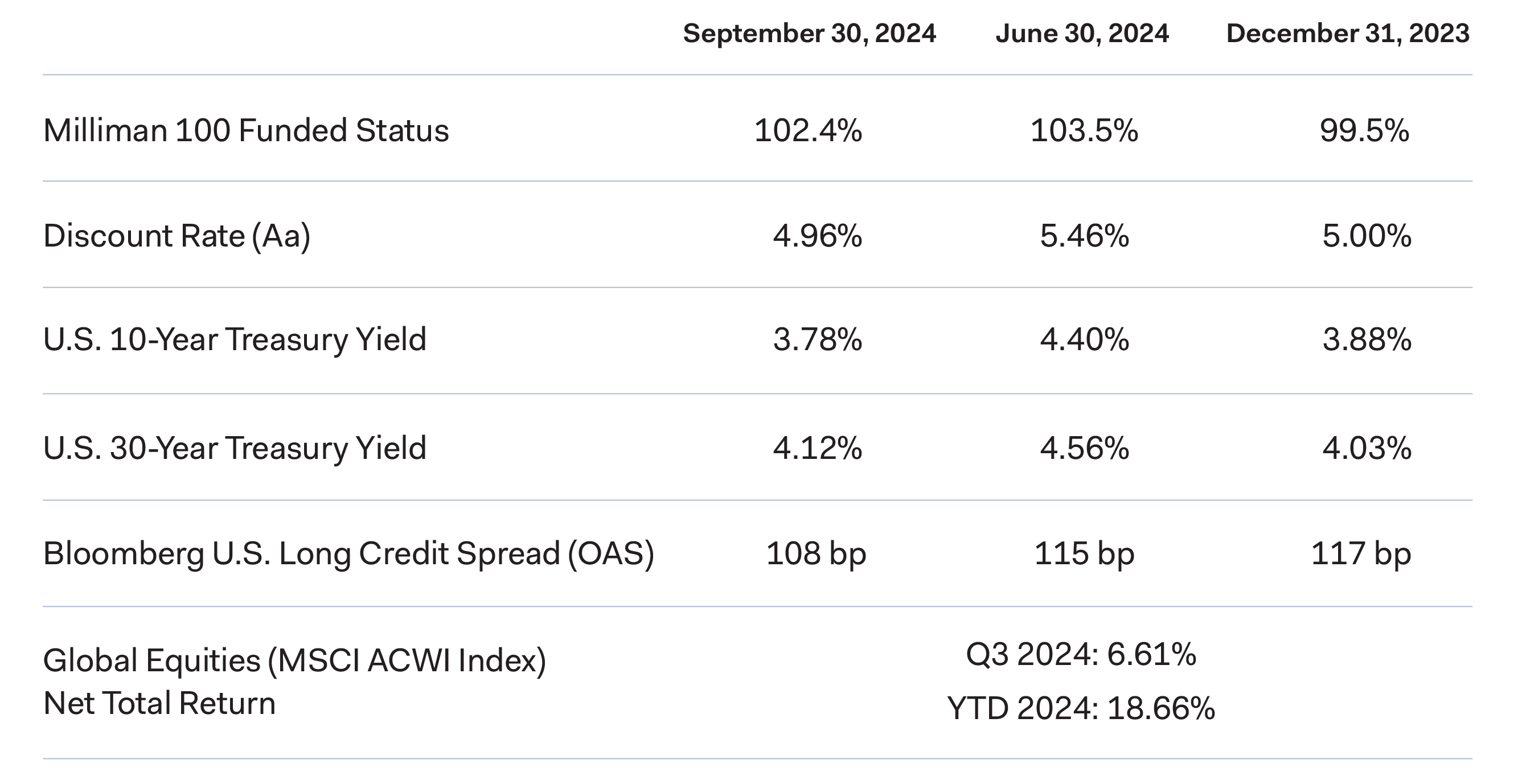 In the third quarter, U.S. Treasury yields fell, corporate spreads tightened, and global equity markets rose. As a result, all major asset classes posted positive returns. Long-duration fixed income, proxied by the Bloomberg U.S. Long Government/Credit Index, returned 8.0% for the quarter, while global equities, proxied by the MSCI All Country World Index (Net), returned 6.6%. In this context, the aggregate funded status of the 100 largest corporate pension plans declined by 1.1 percentage points to 102.4% as asset returns were unable to keep pace with liabilities.2